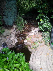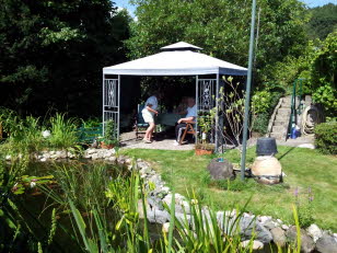 Hier befindet sich ein Sitzbereich unter einem Pavillon. Neben dem Pavillon gibt es einen kleinen Bachlauf der zum Teich führt.