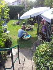 Das Haus steht auf einem Eckgrundstück von knapp 1000qm. Der für die Freizeit nutzbare Teil des Gartens ist hinter dem Haus und neben der Terrasse auf einem Zwischenniveau.