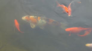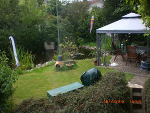 Im Teich tummeln sich Goldfische aller Größen, Kois und auch ein ein Meter langer Stör.